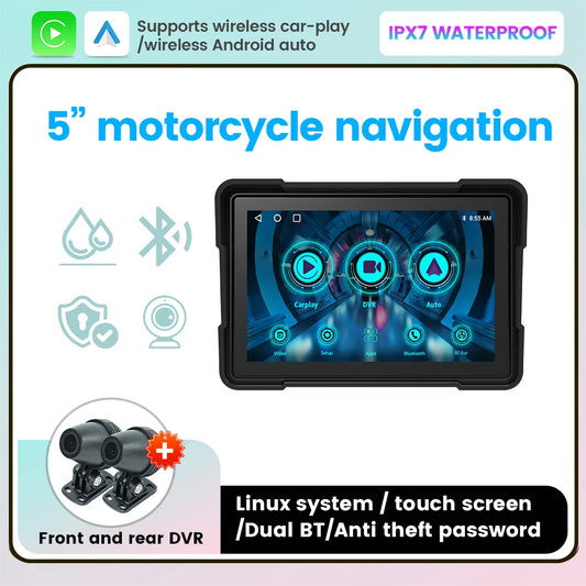 Front & Rear View Motorcycle Camera/Monitor & Apple CarPlay or Android Auto 5 Inch LCD Display IPX7 Waterproof