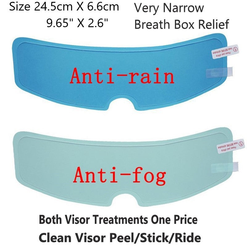 Install these films on your helmet visor and experience fog free and rain drop free riding. You get two visor treatments for full anti-fog and anti-rain treatment! Easily removed and reinstalled on other visors. Ideal for touring or commuting.