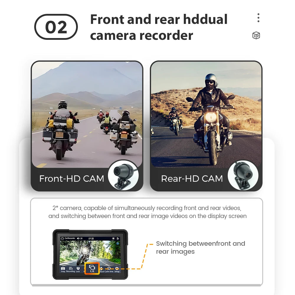 Front & Rear View Motorcycle Camera/Monitor & Apple CarPlay or Android Auto 5 Inch LCD Display IPX7 Waterproof